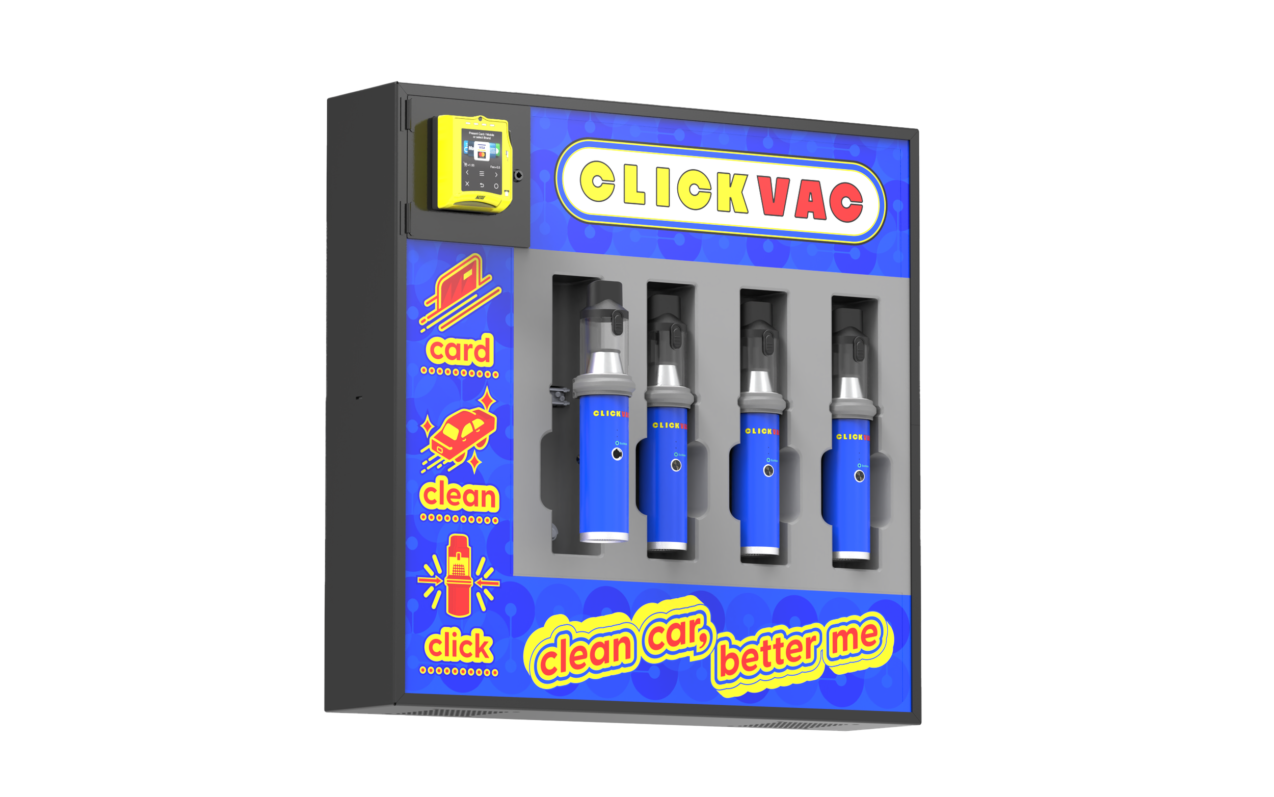ClickVac is a handheld vacuum rental system designed to make car cleaning easy and accessible at gas stations, charging stations, and other convenient locations. Users simply swipe, clean, and click to return the vacuum when finished.